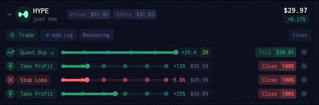 Agents manage positions by setting triggered alerts at key price levels or momentum thresholds. Once an asset is added to the portfolio, the agent will automatically configure alerts to protect and optimize the position.